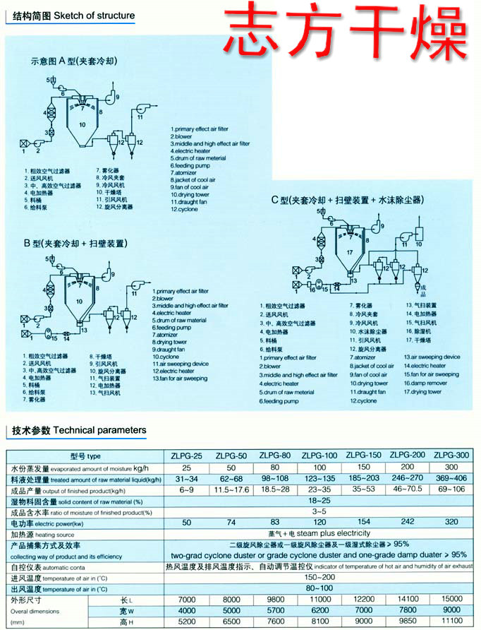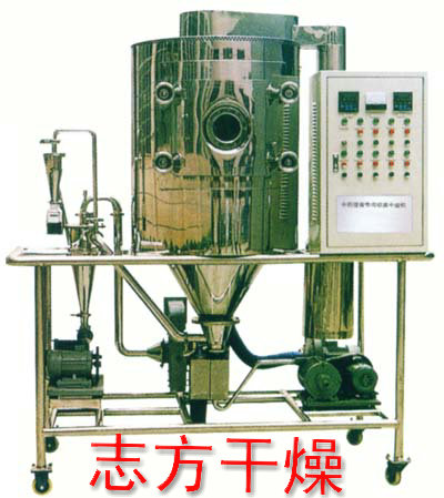 该机采用全封闭形式,所有部件均采用不锈钢制造,配有三级净化装置,过滤后的空气达十万级要求,筒体与顶部均装有冷壁装置,降低壁温,干燥塔内装有气刷扫塔装置,经该机干燥后的中药浸膏粉,不会出现焦化变质现象,大大增加了收粉率,而且不会产生混药现象和粘壁现象。中药浸膏高速离心式喷雾装置是离心式喷雾干燥技术在特定物料的应用,也是利用高速离心式雾化器使物料分散成雾状,与热空气充分接触,完成瞬间干燥,形成粉状成品的干燥装置。中药浸膏高速离心式喷雾装置与普通高速离心式喷雾干燥装置的区别在于:解决了空气的初中三级过滤,物料的瞬间快速固化,物料从塔壁上强劲分离,壁免粘壁重复加热,防止物料的有效成份受热挥发和分解,以及解决了塔体管路清洗等关键技术。