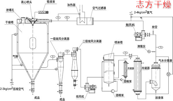 XLP系列闭路循环喷雾干燥机工作原理:闭式循环喷雾干燥系统是在密闭的环境下工作,干燥介质为惰性气体,一般为N,适用于有机溶剂的物料干燥有毒气的物料或干燥过程中易发生氧化的物料的干燥;该系统采用惰性气体作为循环气体,对干燥的物料具有保护作用,循环气体经历载湿、去湿的过程,介质可重复使用;氮气经加热器加热后进入干燥塔,液体物料经螺杆泵输送至离心喷头处,液体被高速循环的雾化器雾化成的粉状物料从塔底排出,被蒸发的有机溶剂气体在风机负压的压力下,把夹在气体中的粉尘经旋风分离器、喷淋塔除尘后饱和的有机溶剂气体经冷凝器冷凝成液体排出冷凝器,不凝性气体介质连续加热后作为干燥载体在系统内重新循环使用。